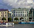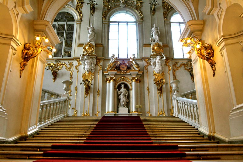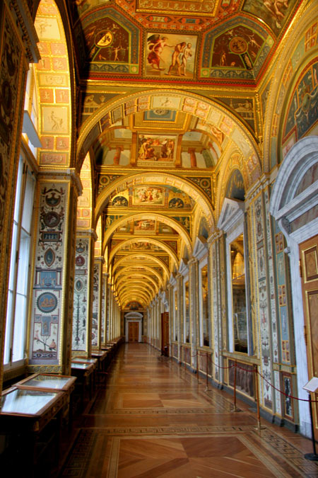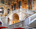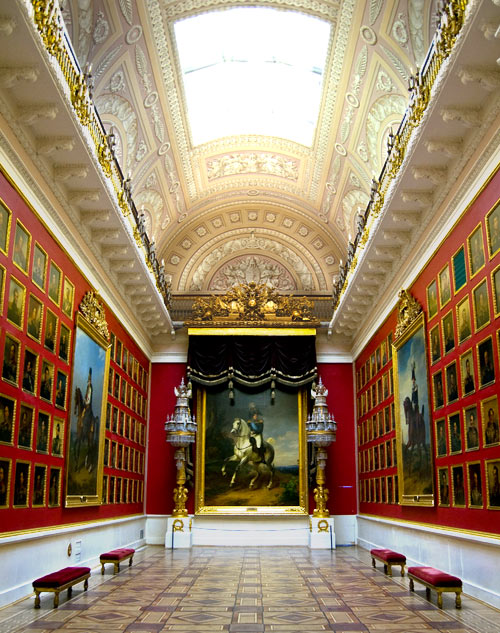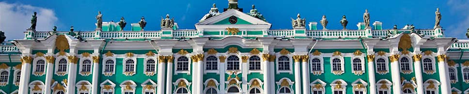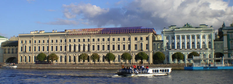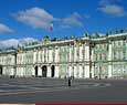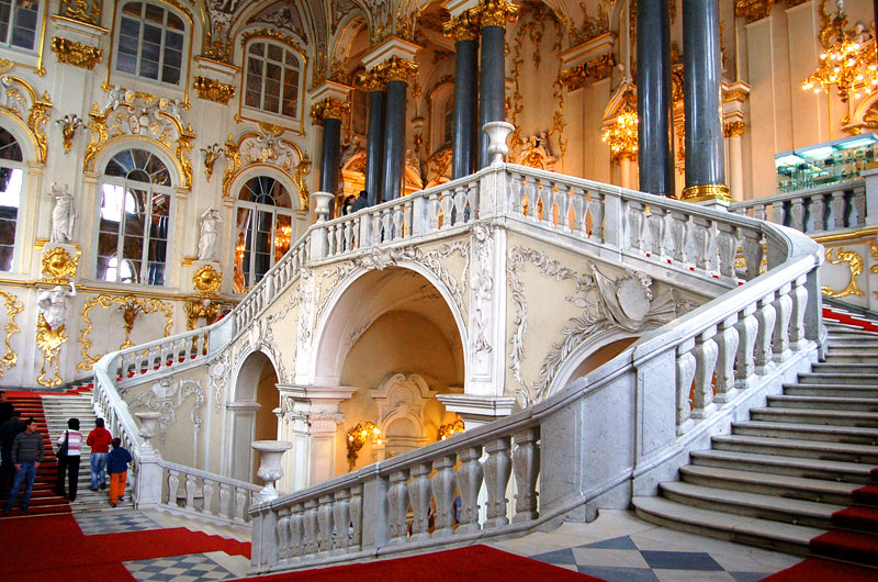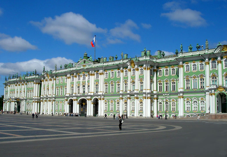 La plaza frente al palacio, obra de Rossi, destaca por el imponente arco del triundo que aunque proyectado un siglo despues que el palacio, nos permite ver que tanto Rastrelli (arquitecto del palacio) como Rossi pensaban en un mismo proyecto escenográfico y conmemorativo del poder imperial. En la actualidad, el palacio junto con otros cuatro edificios forma el museo del Hermitage, uno de los primeros del mundo tanto por su extensión (24 Km de galerias) como por obras. Esta palacio es hermoso arquitectónicamente hablando, y nos sirve para comparar el distinto gusto entre el este y el oeste de Europa, ya que por ejemplo se construyo al mismo tiempo que el palacio real de Madrid y mientras que el primero se basa en la ya atrasada y caduca estética barroca, el palacio español va abriendo paso el nuevo gusto neoclásico.