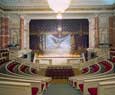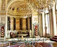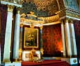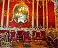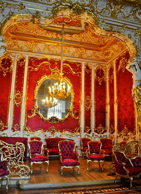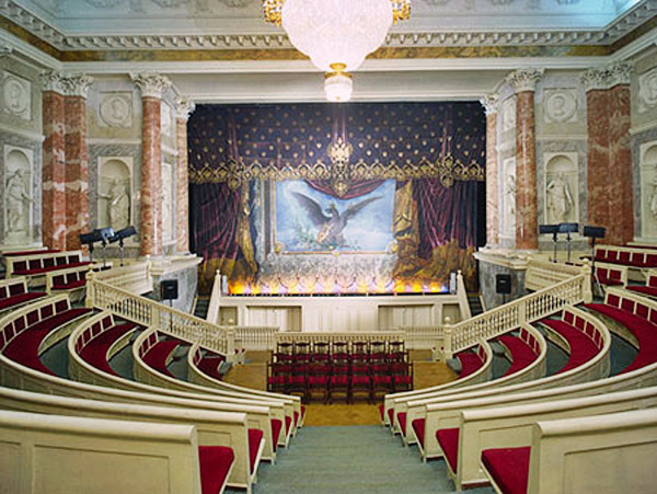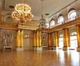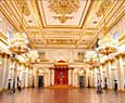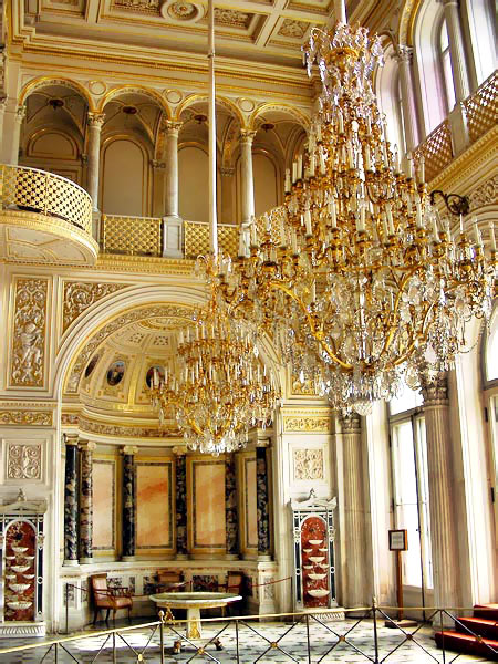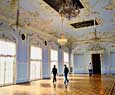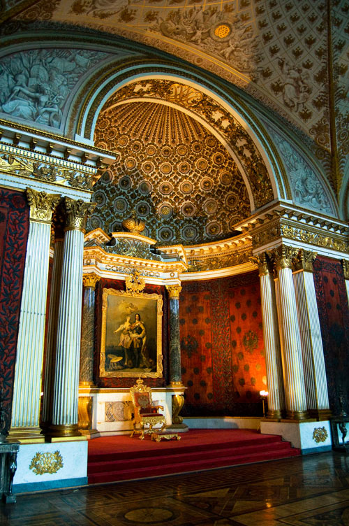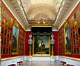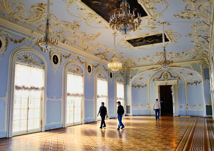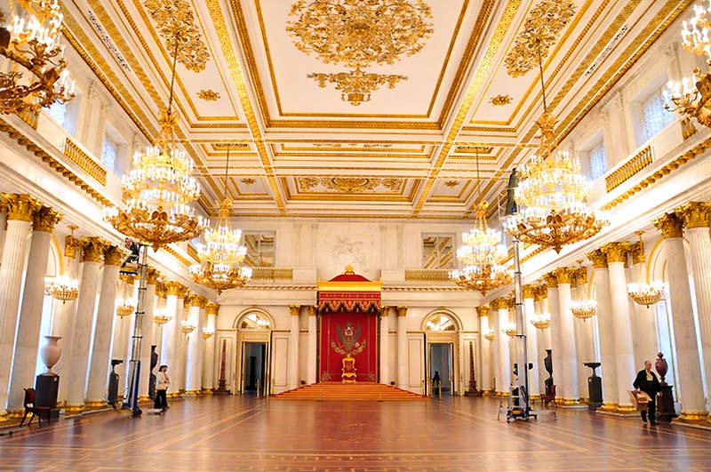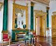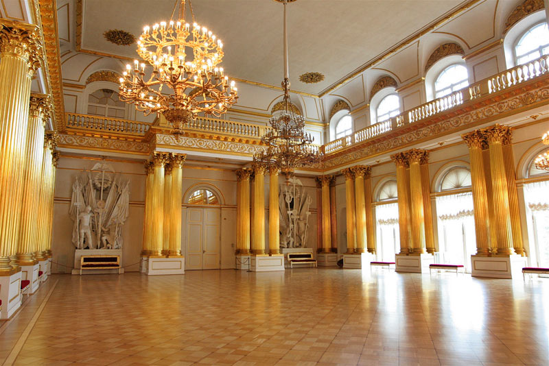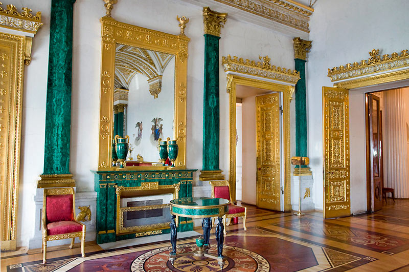 Esta sala, con un paso elevado, es de un acentuado gusto neoclásico y esta adornada con columnas de mármol y numerosas lámparas de cristal. Es necesario atravesar esta sala par llegar a otra bella estanciaa, el pequeño teatro que Catalina II encargo a Quarengui, y que en la actualidad se sigue utilizando. La sala de los escudos, con columnas dorada se utilizaba para las recepciones de la corte. La sala de malaquita (1839) se caracteriza por las 8 columnas y pilares de malaquita y por algunos insólitos objetos de este material, lo que la convierte en una de las mas hermosas y originales del palacio. En este palacio existen dos salones del trono. El mayor de ellos, llamado de San Jorge, era utilizado en las grandes ceremonia de la corte y estaba decorado con un trono bajo solio, mientras que las paredes estaban recorridas por 44 columnas corintias de marmol con capiteles y basas dorados. El otro salon del trono es más pequeño y se situó cerca del anterio. Fue construido en 1833 en honor de Pedro el Grande. Cabe destacar que todas estas salas fueron nuevamente destruidas en el s.XX y que posteriormente han sido restauradas hasta el mínimo detalle.