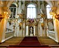 En cuanto a los interiores, han ido cambiando a través de los años, combinando el estilo típico ruso con el gusto neoclásico. Hay que tener en cuenta que en 1837 el palacio sufrió un gran incendio que obligó a una reconstruccion casi total de los interiores. A pesar de que la decoración de los salones han sido alteradas para adecuarlas como salas de exposición, si hay algunas estancias de gran belleza. La primera que nos llama la atención es la escalera de San Jorge que constituye la suntuosa entrada al palacio. Su riqueza resulta extraordinaria con esculturas, mármoles, tallas doradas, columnas policromas, etc. Desde ella, la familia imperial contemplaba la ceremonia del bautismo en el rio Neva. La sala del pabellón servía de paso al Hermitage de Catalina II, en donde la emperatriz exponía su colección de pintura que había reunido a base de comprar las obra a nobles europeos arruinados.