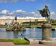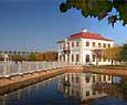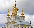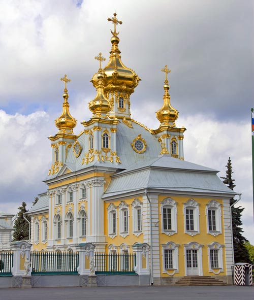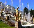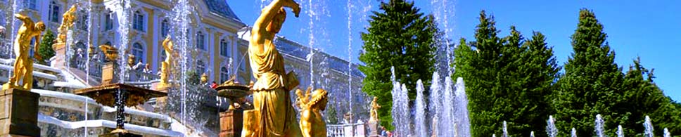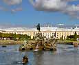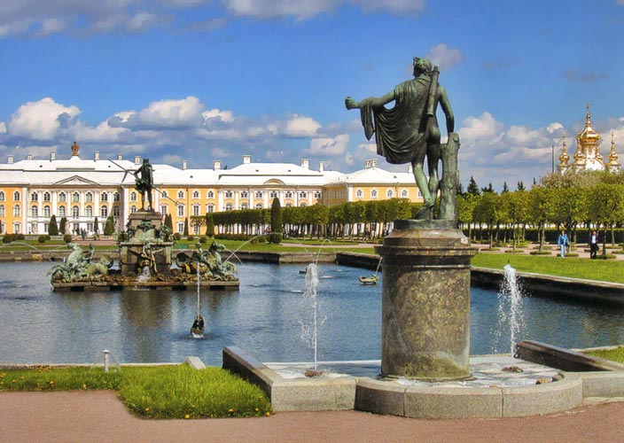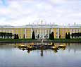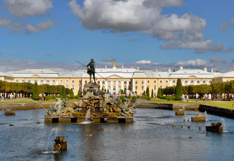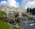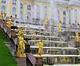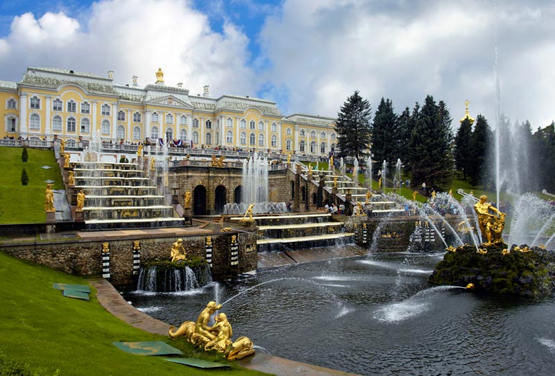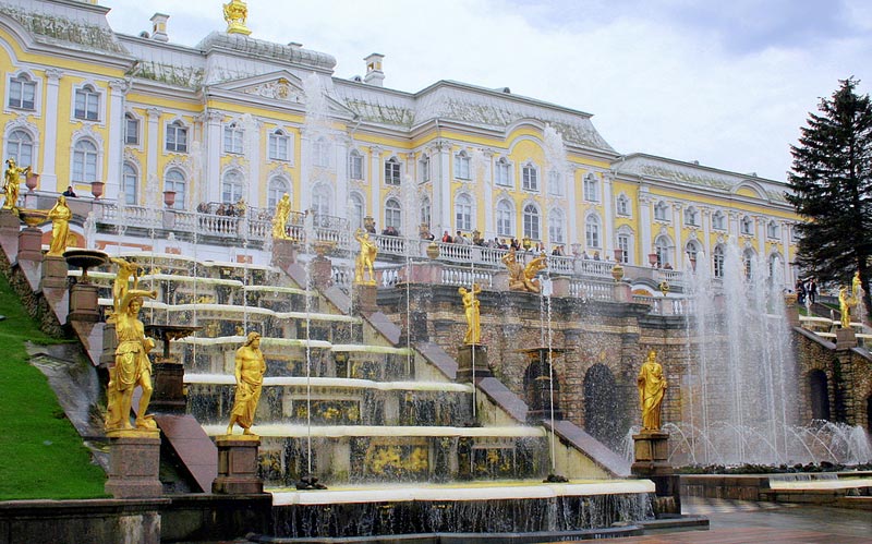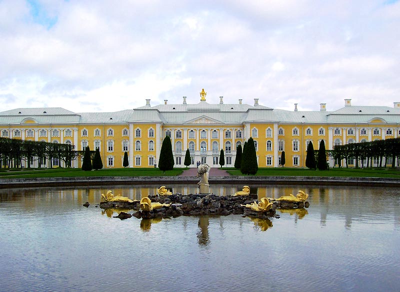 Este palacio se encuentra en las inmediaciones de San Petersburgo, y se comenzó al mismo tiempo que esta ciudad a comienzos del s XVIII. Peterhof es el monumento por excelencia a la voluntad del zar Pedro el Grande de emprender proyectos colosales y triunfalistas para emular e incluso superar a los soberanos europeos en la fastuosidad y velocidad de sus ejecuciones. Este palacio es obra del arquitecto francés J.B. Le Blond, el mismo que proyectó San Petersburgo.