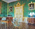 De entre las nuevas estancias neoclásicas destaca el gran Salón del Trono, que posee una relativa sencillez decorativa a base de estucos blancos y verdes. Ocupa toda la anchura del palacio y está jalonado con ventanas y balcones a ambos lados. En el fondo de este salón, sobre el trono, se encuentra un famoso retrato de Catalina II a caballo. Otras de estas nuevas estancias es por ejemplo el comedor. Pero la parte mas impresionante de este palacio es la constituida por sus fuentes y sus cascadas. La mas espectacular cascada es la que se encuentra en fachada trasera y, que nace a los pies del mismo palacio. Esta decorada por 37 esculturas de bronce dorado, 64 fuentes y 142 juegos de agua, y el agua va a parar a un gran canal que desemboca en el Golfo de Finlandia. En el interior de esta cascada, bajo el palacio, existe una gruta en la que existen la ya clásicas esculturas doradas.