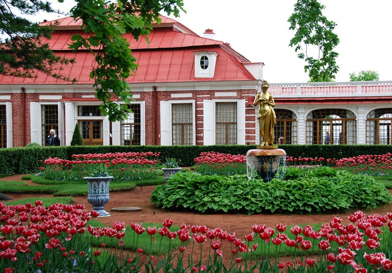 Su construcción sufrió un gran impulso tras la visita de Pedro el Grande a Versalles. La parte original corresponde al centro del actual palacio y fue concluido en 1721, de hecho, San Petersburgo estaba aún en construcción cuando la obras del palacio concluyeron.