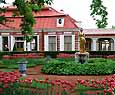 En cuanto al parque, se sigue la tradicional división entre el estilo francés, como en el gran parterre que precede la del palacio, y el estilo ingles. Distribuidos por el parque se encuentran multitud de pabellones, como los palacetes Monplaisir, lugar predilecto de Pedro y que fue su morada durante la contrucción del gran palacio, una Orangerie, un Hermitage... El mas bello es el palacete Marly que se halla frente al la cascada de la montaña dorada y entre dos grandes embalses. Así mismo hay multitud de juegos acuáticos como la cascada del dragón, las fuentes vaticanas, la fuente de neptuno, la de la pirámide......